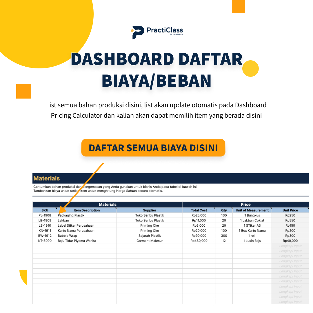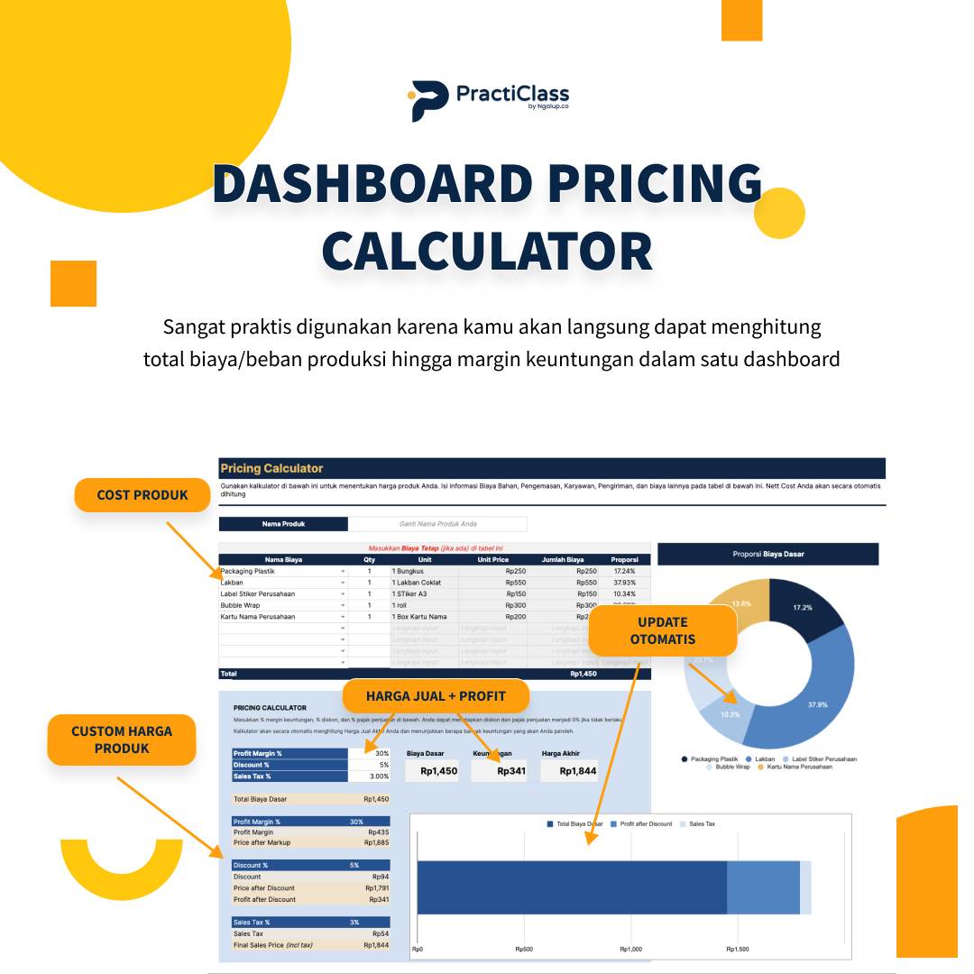 HPP Template Calculator adalah sebuah template yang dapat membantu kamu menghitung dan mengkalkulasikan seluruh biaya dari produk maupun proyek dari sisi bahan baku, pekerja, komisi, diskon, hingga pajak sehingga kamu dapat memberikan harga yang terbaik dari sisi pelanggan maupun bisnis kamu!