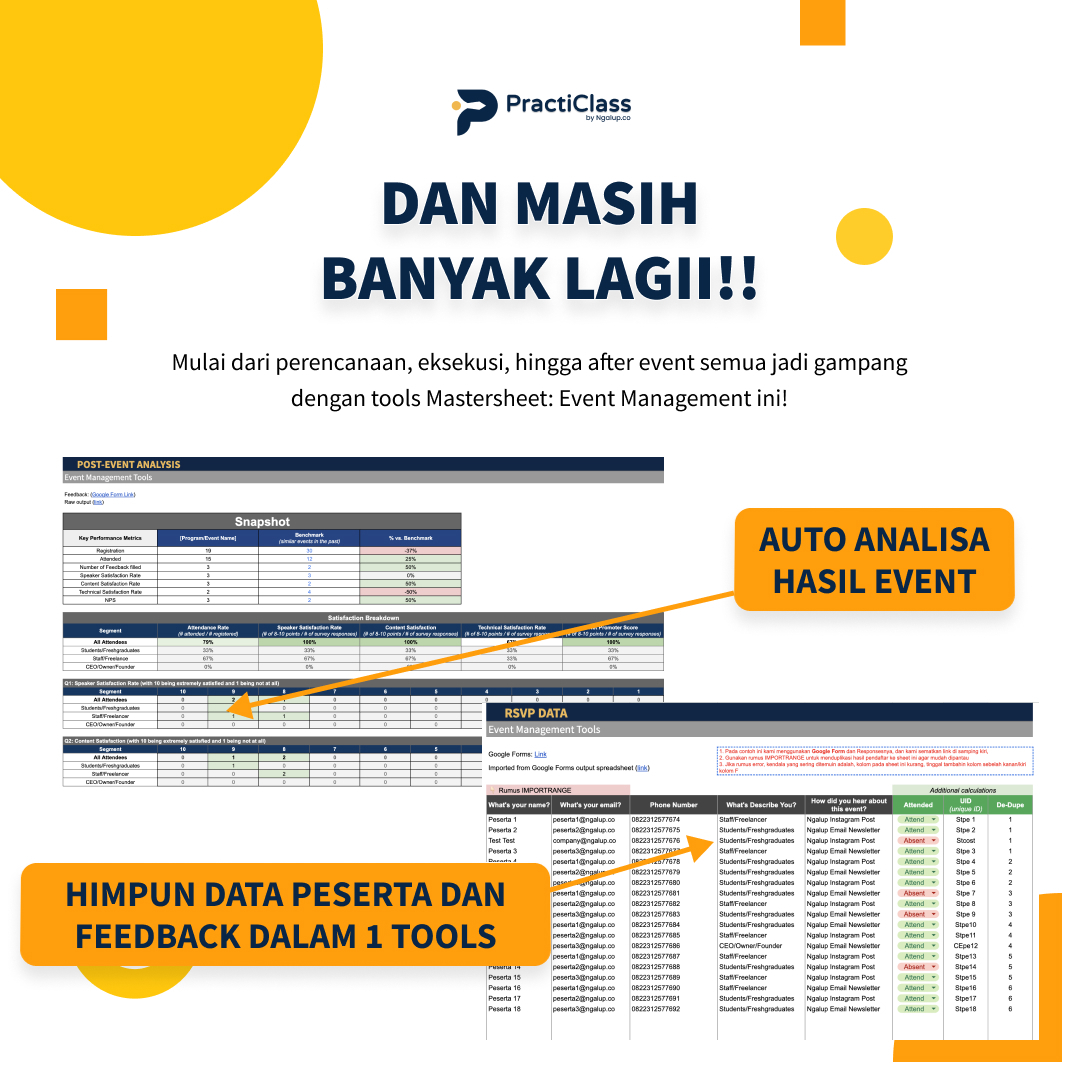 Mastersheet: Event Management Template adalah template yang dirancang khusus untuk membantu kamu merencanakan, mengelola, dan menjalankan event dengan lebih efisien dan profesional. Template ini mencakup seluruh kebutuhan pengelolaan acara, mulai dari budgeting, koordinasi tim, hingga pelacakan hasil agar event kamu sukses dan berkesan!
